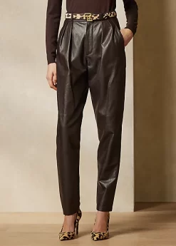 The new-season Rogers trouser is the epitome of Ralph Lauren luxury. Cut for a higher rise and a slim-fitting silhouette, the Rogers trouser is detailed with a bevy of highly considered elements, including double front waist pleats, back waist darts, topstitching on the seams and genuine horn buttons. Italian-made, this style is crafted with full-bodied nappa lambskin to achieve a soft yet sporty appearance.