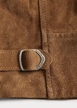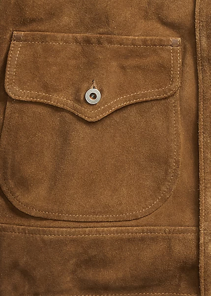 Made from roughout suede. Adjustable buckled tabs on the sides. American-made metal buttons. Lined on the yokes, the sleeves and the waistband.