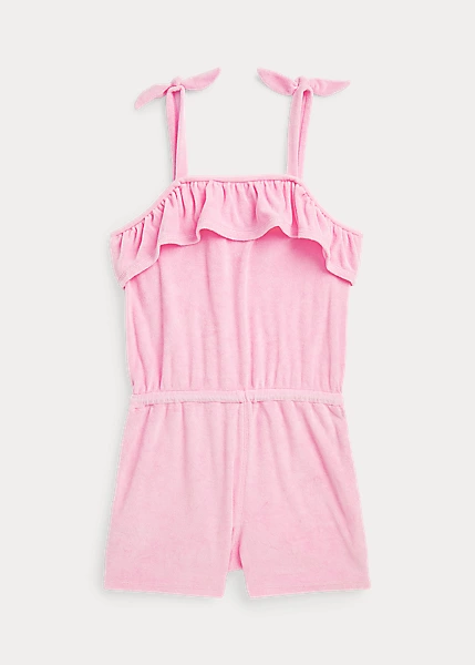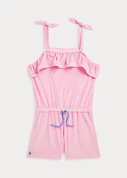 A ruffled overlay and bows on the shoulders make this cotton-blend romper a cute cover-up for pool days and beach trips. Ralph Lauren partners with Better Cottonâ„¢ to improve cotton farming globally. Better Cotton trains farmers to use water efficiently, care for the health of the soil and natural habitats, reduce use of the most harmful chemicals and implement the principles of decent work.