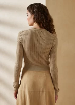 Ralph Lauren updates the timeless cardigan this season with a slim, slightly cropped fit and a mulberry silk fabrication, which is defined by delicate pointelle-lace stitches for a romantic touch.