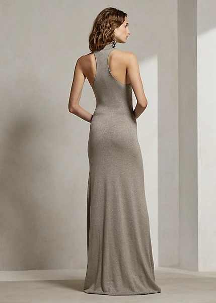 Drawing inspiration from some of Ralph Lauren’s most iconic silhouettes, this evening dress unites a rib-knit roll neck and a sleeveless racerback design. Cut for a body-skimming column silhouette, this dress is knit with a luxurious combination of high-quality viscose yarns and Lurex® filament, transforming this simple fabric into one that shimmers with every step.