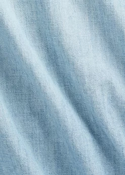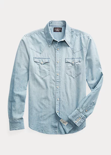 Slim-fitting shirt cut from Japanese cotton chambray. Dyed with indigo and washed. Boot-stitch embroidery on the pockets. Metal button on the collar.