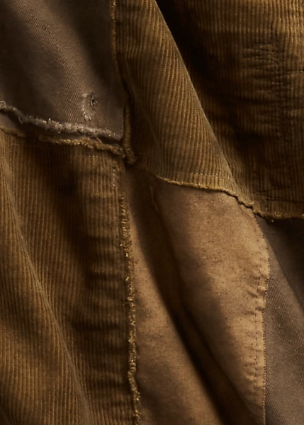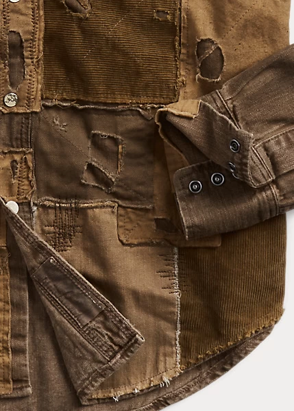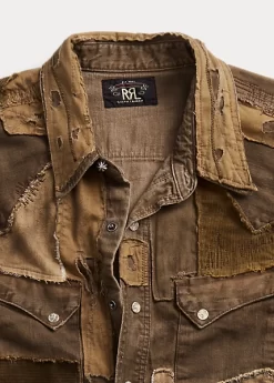 Slim-fitting shirt made with Japanese cotton denim. Detailing inspired by 1950s Westernwear. Heavily laundered and distressed for a timeworn appearance. Patchwork repairs in a mixture of textiles – including twill and fine-wale corduroy – for a unique, one-of-a-kind look.