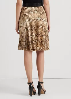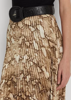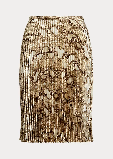 The season’s bold snakeskin print brings a modern sensibility to this midi skirt, while sunburst pleats afford dimension and sweeping movement. A statement-making piece, this skirt is made with glossy satin charmeuse.