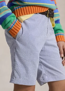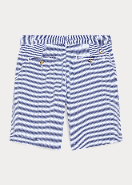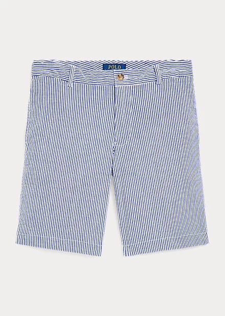 These flat-front shorts are made with stretch cotton seersucker and accented with our multicoloured signature Pony. Ralph Lauren partners with Better Cottonâ„¢ to improve cotton farming globally. Better Cotton trains farmers to use water efficiently, care for the health of the soil and natural habitats, reduce use of the most harmful chemicals and implement the principles of decent work.