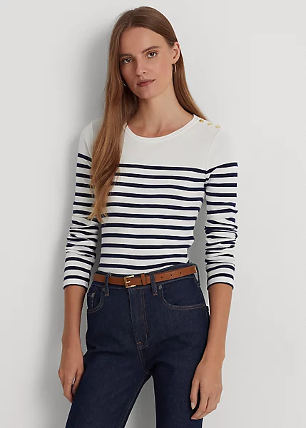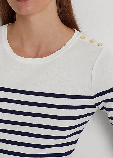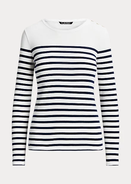 “LRL”-engraved snaps on the shoulder and an “LRL”-embroidered logo on the hem bring signature style to this classic striped tee. It’s made with lightweight cotton for a soft hand.