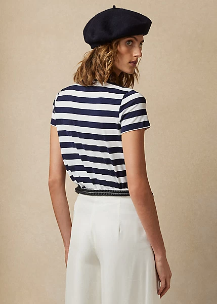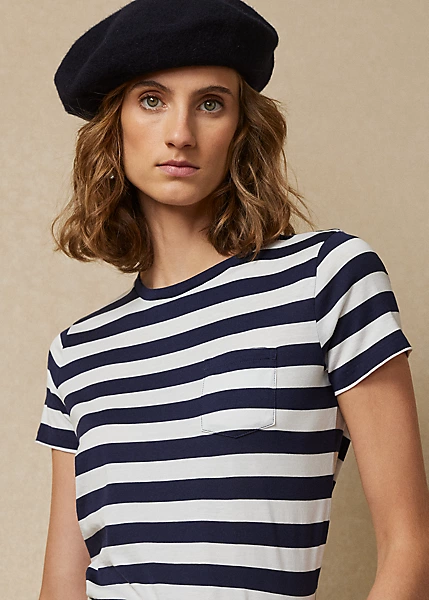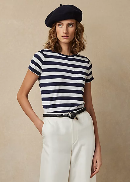 Ralph Lauren’s luxurious take on the essential tee unites Peruvian-sourced Pima cotton jersey with a wide stripe motif and Ralph Lauren’s signature embroidered on the hem.