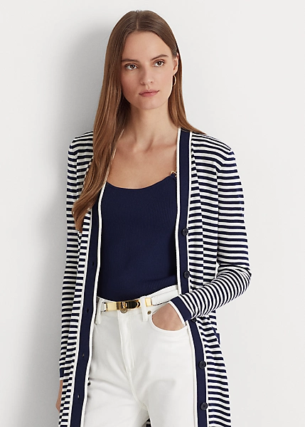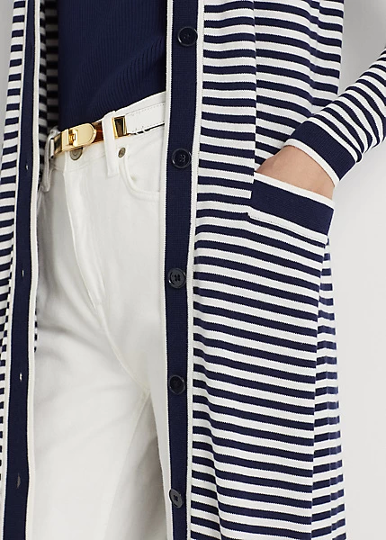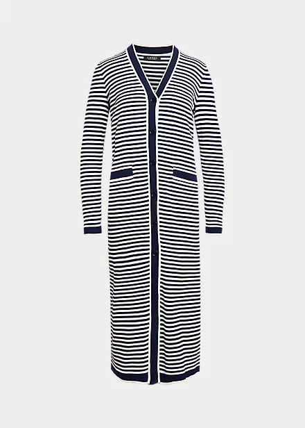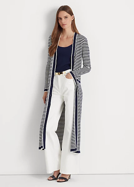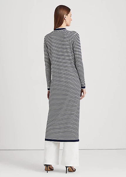 Luxury meets comfort in this calf-grazing striped cardigan, which is crafted with an ultra-soft silk blend.