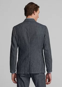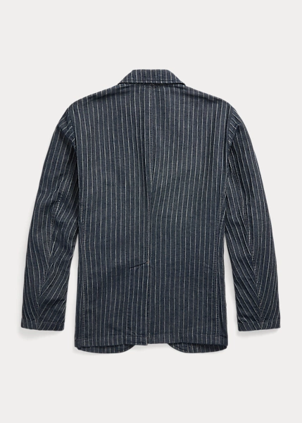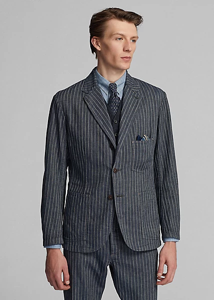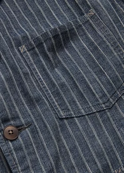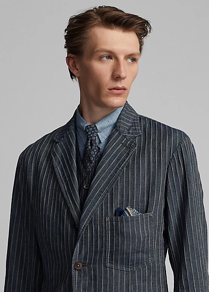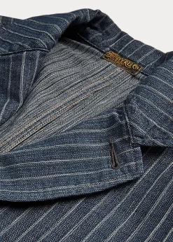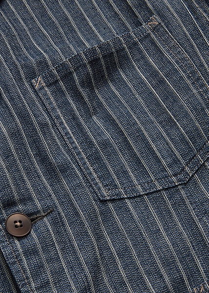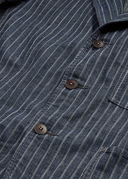 Notch-lapel sport coat with workwear-inspired stitching and pockets. Made with striped cotton-and-linen herringbone cloth from Japan. Yarn-dyed with indigo and washed. Finished with corozo buttons.