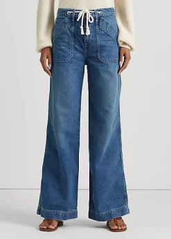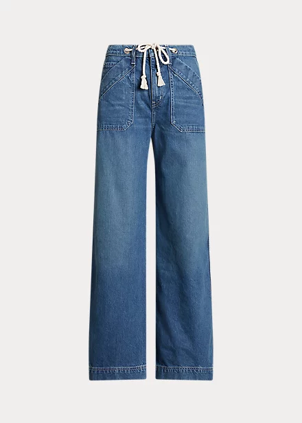 Rendered in right-hand twill denim, these breezy wide-leg jeans are designed with intentional distressing and a drawcord waist with tassel ends for an effortless, vintage-inspired look.